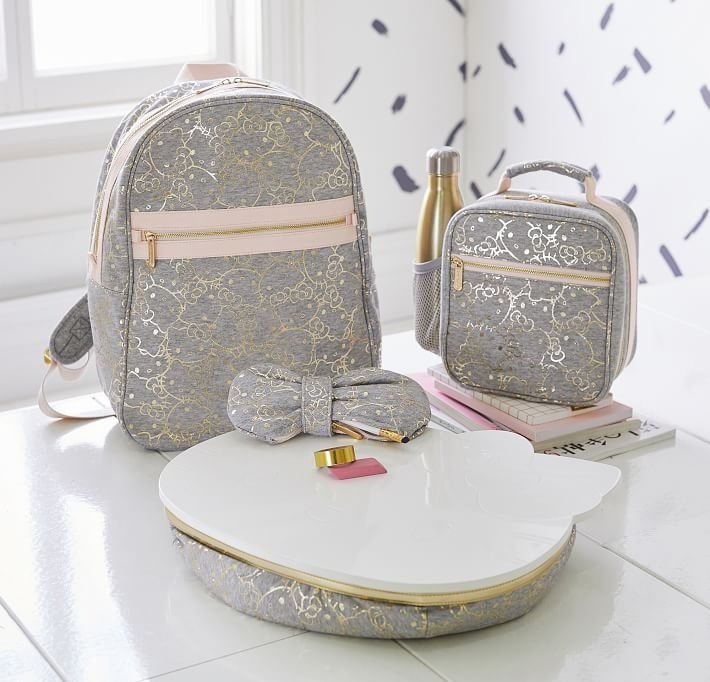 Hello Kitty is one of the most popular and recognizable characters in the world, created in 1974 by Yuko Shimizu and currently designed by Yuko Yamaguchi. Hello Kitty is a small, round, white cat with a red bow and no visible mouth. She is portrayed as a sweet and gentle character, and has become a cultural icon and a globally recognized brand. Pottery Barn Teen collaborated with Hello Kitty on a casual athleisure inspired home decor and back-to-school accessories capsule collection. The gear collection features a backpack, lunch box, and bow shaped pencil case in cotton jersey knit fabric with gold foil printing of tossed Hello Kitty faces, blush pink canvas accents, cotton webbing, gold metal zippers, and branded hello kitty zipper pullers.